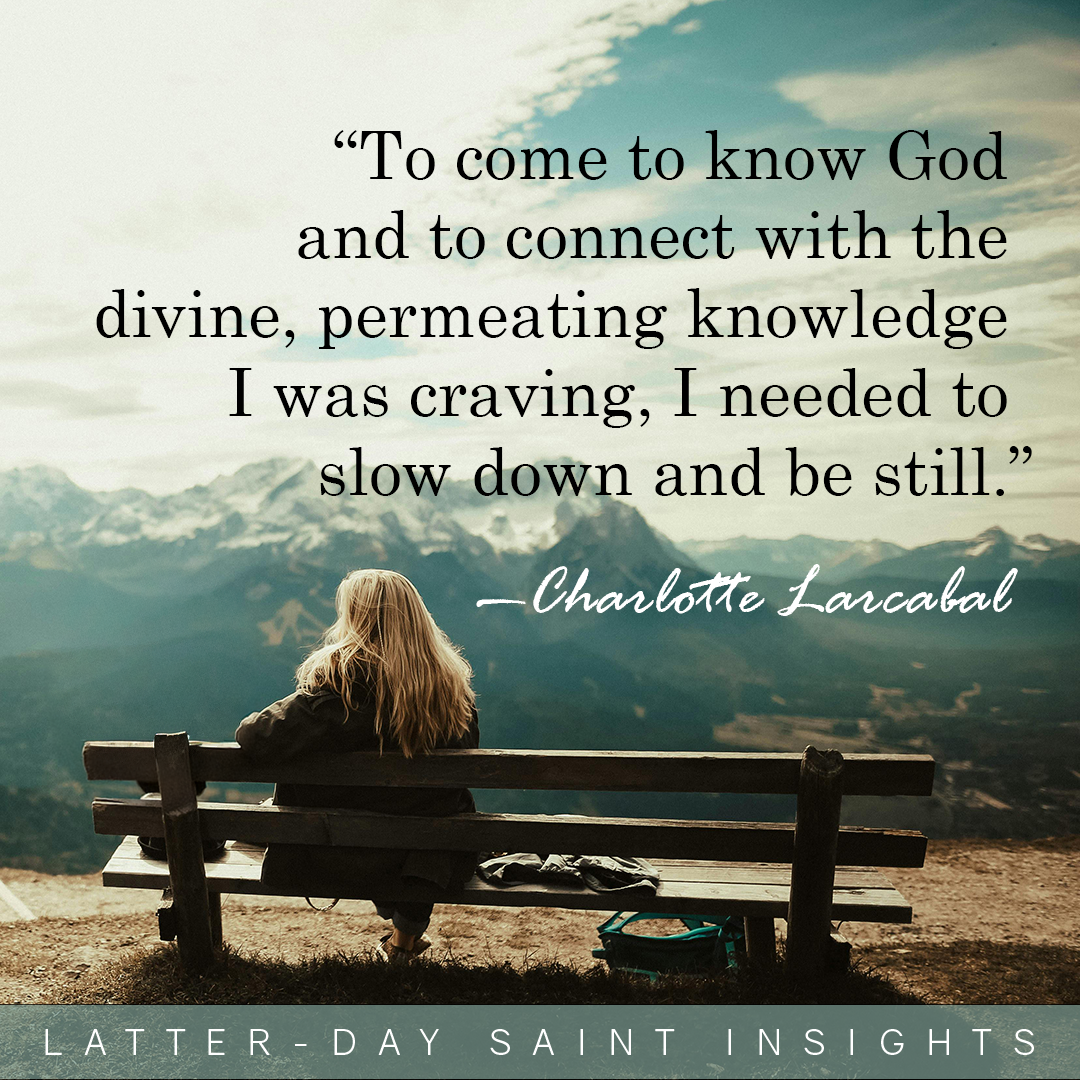 "To come to know God and to connect with the divine, permeating knowledge I was craving, I needed to show down and be still." A woman sitting on a bench overlooking a mountain.